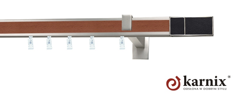 Ozdobne pasy wzdłuż szyny apartamentowej do ściany Aveno harmonizują wraz z chromowo-matowym kolorem karnisza. Dostępne kolory to: biały, buk, calvados, dąb, mahoń, wenge. Linie karniszy Aveno dopełniają także końcówki które można dobrać do pasa szyny.
