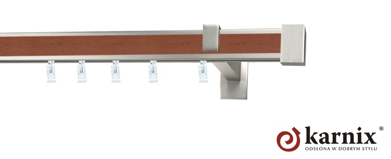 Ozdobne pasy wzdłuż szyny apartamentowej do ściany Aveno harmonizują wraz z chromowo-matowym kolorem karnisza. Dostępne kolory to: biały, buk, calvados, dąb, mahoń, wenge. Linie karniszy Aveno dopełniają także końcówki które można dobrać do pasa szyny.