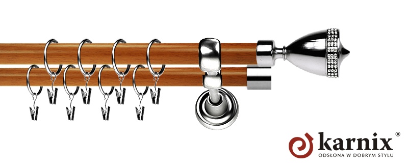 Karnisze Prestige z kolekcji firmy KARNIX to  propozycja dla wielbicieli tradycyjnego wzornictwa. Wprowadzając do sprzedaży tę linię karniszy, postanowiliśmy połączyć przeszłość z przyszłością, aby wykreować ponadczasową kolekcję. Uniwersalność i pomysłowość  to słowa klucze, które w skrócie charakteryzują kolekcję karniszy rzymskich. Elementy karniszy w całości wykonane są z metalu pokrytego powłoką galwaniczną oraz warstwą lakieru, która zwiększa odporność na ścieranie. Rury wykonane są z metalu pokrytego warstwą ochronną PVC TUBE THERMO SHRINK w naturalnych kolorach drewna.