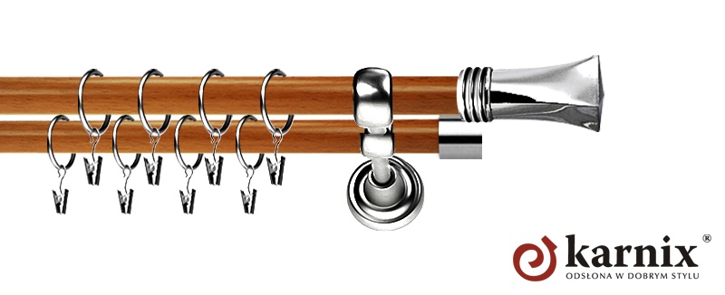 Karnisze Prestige z kolekcji firmy KARNIX to  propozycja dla wielbicieli tradycyjnego wzornictwa. Wprowadzając do sprzedaży tę linię karniszy, postanowiliśmy połączyć przeszłość z przyszłością, aby wykreować ponadczasową kolekcję. Uniwersalność i pomysłowość  to słowa klucze, które w skrócie charakteryzują kolekcję karniszy rzymskich. Elementy karniszy w całości wykonane są z metalu pokrytego powłoką galwaniczną oraz warstwą lakieru, która zwiększa odporność na ścieranie. Rury wykonane są z metalu pokrytego warstwą ochronną PVC TUBE THERMO SHRINK w naturalnych kolorach drewna.