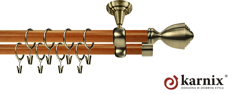 Karnisze Prestige z kolekcji firmy KARNIX to  propozycja dla wielbicieli tradycyjnego wzornictwa. Wprowadzając do sprzedaży tę linię karniszy, postanowiliśmy połączyć przeszłość z przyszłością, aby wykreować ponadczasową kolekcję. Uniwersalność i pomysłowość  to słowa klucze, które w skrócie charakteryzują kolekcję karniszy rzymskich. Elementy karniszy w całości wykonane są z metalu pokrytego powłoką galwaniczną oraz warstwą lakieru, która zwiększa odporność na ścieranie. Rury wykonane są z metalu pokrytego warstwą ochronną PVC TUBE THERMO SHRINK w naturalnych kolorach drewna.