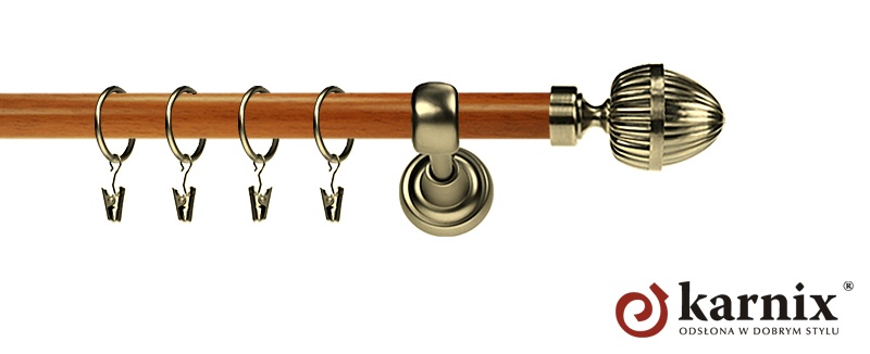 Karnisze Prestige z kolekcji firmy KARNIX to  propozycja dla wielbicieli tradycyjnego wzornictwa. Wprowadzając do sprzedaży tę linię karniszy, postanowiliśmy połączyć przeszłość z przyszłością, aby wykreować ponadczasową kolekcję. Uniwersalność i pomysłowość  to słowa klucze, które w skrócie charakteryzują kolekcję karniszy rzymskich. Elementy karniszy w całości wykonane są z metalu pokrytego powłoką galwaniczną oraz warstwą lakieru, która zwiększa odporność na ścieranie. Rury wykonane są z metalu pokrytego warstwą ochronną PVC TUBE THERMO SHRINK w naturalnych kolorach drewna.