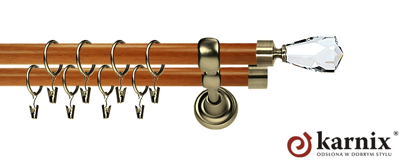 Karnisze Prestige z kolekcji firmy KARNIX to  propozycja dla wielbicieli tradycyjnego wzornictwa. Wprowadzając do sprzedaży tę linię karniszy, postanowiliśmy połączyć przeszłość z przyszłością, aby wykreować ponadczasową kolekcję. Uniwersalność i pomysłowość  to słowa klucze, które w skrócie charakteryzują kolekcję karniszy rzymskich. Elementy karniszy w całości wykonane są z metalu pokrytego powłoką galwaniczną oraz warstwą lakieru, która zwiększa odporność na ścieranie. Rury wykonane są z metalu pokrytego warstwą ochronną PVC TUBE THERMO SHRINK w naturalnych kolorach drewna.