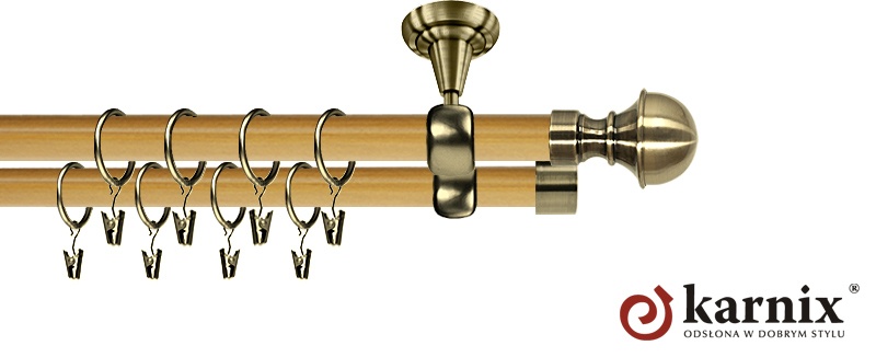 Karnisze Prestige z kolekcji firmy KARNIX to  propozycja dla wielbicieli tradycyjnego wzornictwa. Wprowadzając do sprzedaży tę linię karniszy, postanowiliśmy połączyć przeszłość z przyszłością, aby wykreować ponadczasową kolekcję. Uniwersalność i pomysłowość  to słowa klucze, które w skrócie charakteryzują kolekcję karniszy rzymskich. Elementy karniszy w całości wykonane są z metalu pokrytego powłoką galwaniczną oraz warstwą lakieru, która zwiększa odporność na ścieranie. Rury wykonane są z metalu pokrytego warstwą ochronną PVC TUBE THERMO SHRINK w naturalnych kolorach drewna.