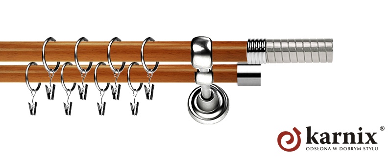 Karnisze Prestige z kolekcji firmy KARNIX to  propozycja dla wielbicieli tradycyjnego wzornictwa. Wprowadzając do sprzedaży tę linię karniszy, postanowiliśmy połączyć przeszłość z przyszłością, aby wykreować ponadczasową kolekcję. Uniwersalność i pomysłowość  to słowa klucze, które w skrócie charakteryzują kolekcję karniszy rzymskich. Elementy karniszy w całości wykonane są z metalu pokrytego powłoką galwaniczną oraz warstwą lakieru, która zwiększa odporność na ścieranie. Rury wykonane są z metalu pokrytego warstwą ochronną PVC TUBE THERMO SHRINK w naturalnych kolorach drewna.