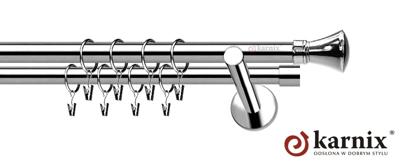Karnisze Nowoczesne NEO z nowej kolekcji firmy KARNIX to  propozycja skierowana do wielbicieli nowoczesnego wzornictwa. Wprowadzając do sprzedaży tę nową, designerską linię nowoczesnych karniszy, postanowiliśmy połączyć przeszłość z przyszłością, aby wykreować ponadczasową kolekcję. Jakość, pomysłowość i nowoczesność  to słowa klucze, które w skrócie charakteryzują kolekcję karniszy nowoczesnych NEO. Elementy karniszy nowoczesnych NEO w całości wykonane są z metalu pokrytego powłoką galwaniczną oraz warstwą lakieru, która zwiększa odporność na ścieranie.