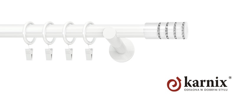 Karnisz nowoczesny NEO Rosetti Crystal w białym kolorze to propozycja, która doskonale uzupełnia elegancki przestrzenie, nadając im wyjątkowego charakteru. Cechami charakterystycznymi tego produktu jest biała barwa, która została uzyskana poprzez nałożenie lakieru na metalowe elementy galwanizowane. Wszystko to zapewnia doskonałą trwałość naszych karniszy i długotrwałe użytkowanie bez powstawania rys i uszkodzeń. Dodatkowo, zakończenie rury zostało wykonane w kształcie małego walca ozdobionego kryształkami odbijającymi światło i mieniącymi się tysiącem barw. Wszystko to składa się na niezwykle wysoką estetykę karnisza Neo. Jednak Rosetti Crystal to nie tylko wspaniały wygląd, ale także funkcjonalność. Kółka z żabkami, które pozwalają zamocować firany lub zasłony, zostały wykonane z innowacyjnych materiałów w technologii cichego przesuwu, dzięki czemu odsłanianie lub zasłanianie okna odbywa się bardzo płynnie i praktycznie bezszelestnie. Rozwiązanie to wprowadza karnisze na całkiem nowy poziom, pozwalając kwalifikować je jako wyjątkowe dodatki do wnętrz mieszkalnych. Komplet zawiera dwa wsporniki, rurę, a także zestaw kółek. Gwarantujemy zadowolenie z zakupu.