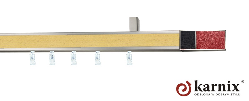 Ozdobne pasy wzdłuż szyny Aveno harmonizują wraz z chromowo-matowym kolorem karnisza. Dostępne kolory to: biały, buk, calvados, dąb, mahoń, wenge. Linie karniszy Aveno dopełniają także końcówki które można dobrać do pasa szyny.