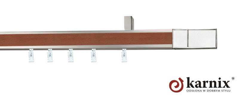 Ozdobne pasy wzdłuż szyny Aveno harmonizują wraz z chromowo-matowym kolorem karnisza. Dostępne kolory to: biały, buk, calvados, dąb, mahoń, wenge. Linie karniszy Aveno dopełniają także końcówki które można dobrać do pasa szyny.
