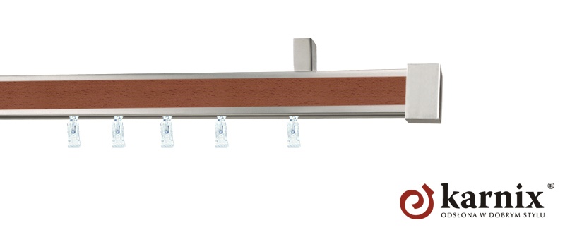 Ozdobne pasy wzdłuż szyny Aveno harmonizują wraz z chromowo-matowym kolorem karnisza. Dostępne kolory to: biały, buk, calvados, dąb, mahoń, wenge. Linie karniszy Aveno dopełniają także końcówki które można dobrać do pasa szyny.