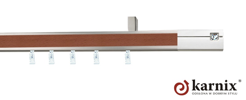 Ozdobne pasy wzdłuż szyny Aveno harmonizują wraz z chromowo-matowym kolorem karnisza. Dostępne kolory to: biały, buk, calvados, dąb, mahoń, wenge. Linie karniszy Aveno dopełniają także końcówki które można dobrać do pasa szyny.