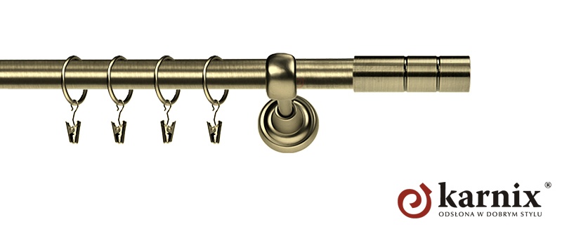 Karnisze Metalowe Rzymskie z kolekcji firmy KARNIX to  propozycja dla wielbicieli tradycyjnego wzornictwa. Wprowadzając do sprzedaży tę linię karniszy metalowych, postanowiliśmy połączyć przeszłość z przyszłością, aby wykreować ponadczasową kolekcję. Uniwersalność i pomysłowość  to słowa klucze, które w skrócie charakteryzują kolekcję karniszy metalowych rzymskich. Elementy karniszy w całości wykonane są z metalu pokrytego powłoką galwaniczną oraz warstwą lakieru, która zwiększa odporność na ścieranie. Uwaga. Inox oraz antracyt dostępne są przy średnicach 19 i 25mm.