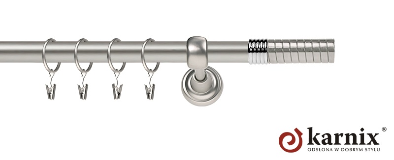Karnisze Metalowe Rzymskie z kolekcji firmy KARNIX to  propozycja dla wielbicieli tradycyjnego wzornictwa. Wprowadzając do sprzedaży tę linię karniszy metalowych, postanowiliśmy połączyć przeszłość z przyszłością, aby wykreować ponadczasową kolekcję. Uniwersalność i pomysłowość  to słowa klucze, które w skrócie charakteryzują kolekcję karniszy metalowych rzymskich. Elementy karniszy w całości wykonane są z metalu pokrytego powłoką galwaniczną oraz warstwą lakieru, która zwiększa odporność na ścieranie. Uwaga. Inox oraz antracyt dostępne są przy średnicach 19 i 25mm.