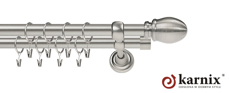 Karnisze Metalowe Rzymskie z kolekcji firmy KARNIX to  propozycja dla wielbicieli tradycyjnego wzornictwa. Wprowadzając do sprzedaży tę linię karniszy metalowych, postanowiliśmy połączyć przeszłość z przyszłością, aby wykreować ponadczasową kolekcję. Uniwersalność i pomysłowość  to słowa klucze, które w skrócie charakteryzują kolekcję karniszy metalowych rzymskich. Elementy karniszy w całości wykonane są z metalu pokrytego powłoką galwaniczną oraz warstwą lakieru, która zwiększa odporność na ścieranie. Uwaga. Inox oraz antracyt dostępne są przy średnicach 19 i 25mm.