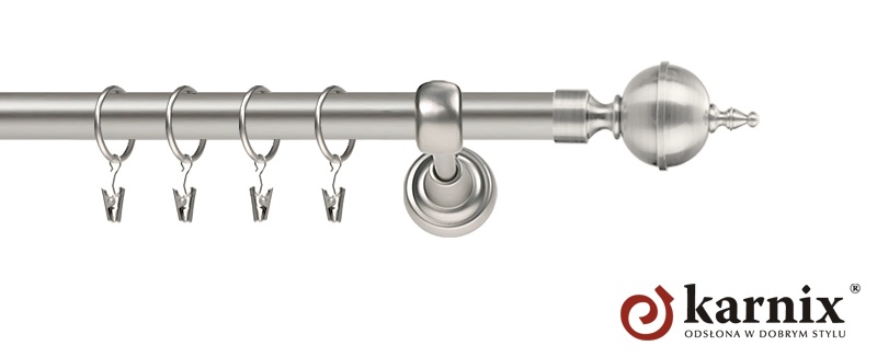 Karnisze Metalowe Rzymskie z kolekcji firmy KARNIX to  propozycja dla wielbicieli tradycyjnego wzornictwa. Wprowadzając do sprzedaży tę linię karniszy metalowych, postanowiliśmy połączyć przeszłość z przyszłością, aby wykreować ponadczasową kolekcję. Uniwersalność i pomysłowość  to słowa klucze, które w skrócie charakteryzują kolekcję karniszy metalowych rzymskich. Elementy karniszy w całości wykonane są z metalu pokrytego powłoką galwaniczną oraz warstwą lakieru, która zwiększa odporność na ścieranie. Uwaga. Inox oraz antracyt dostępne są przy średnicach 19 i 25mm.