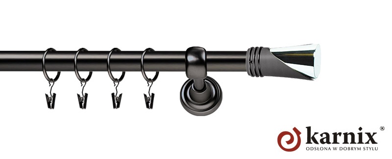 Karnisze Metalowe Rzymskie z kolekcji firmy KARNIX to  propozycja dla wielbicieli tradycyjnego wzornictwa. Wprowadzając do sprzedaży tę linię karniszy metalowych, postanowiliśmy połączyć przeszłość z przyszłością, aby wykreować ponadczasową kolekcję. Uniwersalność i pomysłowość  to słowa klucze, które w skrócie charakteryzują kolekcję karniszy metalowych rzymskich. Elementy karniszy w całości wykonane są z metalu pokrytego powłoką galwaniczną oraz warstwą lakieru, która zwiększa odporność na ścieranie. Uwaga. Inox oraz antracyt dostępne są przy średnicach 19 i 25mm.