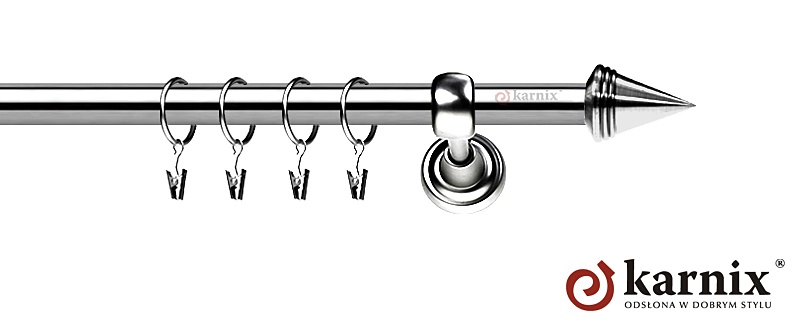 Karnisze Metalowe Rzymskie z kolekcji firmy KARNIX to  propozycja dla wielbicieli tradycyjnego wzornictwa. Wprowadzając do sprzedaży tę linię karniszy metalowych, postanowiliśmy połączyć przeszłość z przyszłością, aby wykreować ponadczasową kolekcję. Uniwersalność i pomysłowość  to słowa klucze, które w skrócie charakteryzują kolekcję karniszy metalowych rzymskich. Elementy karniszy w całości wykonane są z metalu pokrytego powłoką galwaniczną oraz warstwą lakieru, która zwiększa odporność na ścieranie. Uwaga. Inox oraz antracyt dostępne są przy średnicach 19 i 25mm.