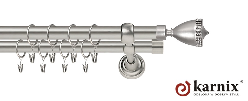 Karnisze Metalowe Rzymskie z kolekcji firmy KARNIX to  propozycja dla wielbicieli tradycyjnego wzornictwa. Wprowadzając do sprzedaży tę linię karniszy, postanowiliśmy połączyć przeszłość z przyszłością, aby wykreować ponadczasową kolekcję. Uniwersalność i pomysłowość  to słowa klucze, które w skrócie charakteryzują kolekcję karniszy metalowych rzymskich. Elementy karniszy w całości wykonane są z metalu pokrytego powłoką galwaniczną oraz warstwą lakieru, która zwiększa odporność na ścieranie. Uwaga. Inox oraz antracyt dostępne są przy średnicach 19 i 25mm.