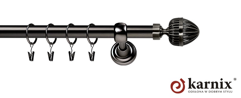 Karnisze Metalowe Rzymskie z kolekcji firmy KARNIX to  propozycja dla wielbicieli tradycyjnego wzornictwa. Wprowadzając do sprzedaży tę linię karniszy, postanowiliśmy połączyć przeszłość z przyszłością, aby wykreować ponadczasową kolekcję. Uniwersalność i pomysłowość  to słowa klucze, które w skrócie charakteryzują kolekcję karniszy metalowych rzymskich. Elementy karniszy w całości wykonane są z metalu pokrytego powłoką galwaniczną oraz warstwą lakieru, która zwiększa odporność na ścieranie. Uwaga. Inox oraz antracyt dostępne są przy średnicach 19 i 25mm.