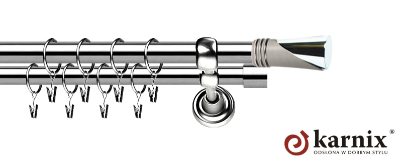 Karnisze Metalowe Rzymskie z kolekcji firmy KARNIX to  propozycja dla wielbicieli tradycyjnego wzornictwa. Wprowadzając do sprzedaży tę linię karniszy, postanowiliśmy połączyć przeszłość z przyszłością, aby wykreować ponadczasową kolekcję. Uniwersalność i pomysłowość  to słowa klucze, które w skrócie charakteryzują kolekcję karniszy metalowych rzymskich. Elementy karniszy w całości wykonane są z metalu pokrytego powłoką galwaniczną oraz warstwą lakieru, która zwiększa odporność na ścieranie. Uwaga. Inox oraz antracyt dostępne są przy średnicach 19 i 25mm.