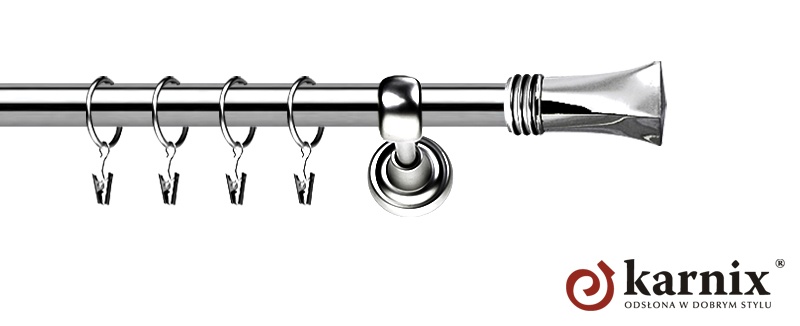 Karnisze Metalowe Rzymskie z kolekcji firmy KARNIX to  propozycja dla wielbicieli tradycyjnego wzornictwa. Wprowadzając do sprzedaży tę linię karniszy, postanowiliśmy połączyć przeszłość z przyszłością, aby wykreować ponadczasową kolekcję. Uniwersalność i pomysłowość  to słowa klucze, które w skrócie charakteryzują kolekcję karniszy metalowych rzymskich. Elementy karniszy w całości wykonane są z metalu pokrytego powłoką galwaniczną oraz warstwą lakieru, która zwiększa odporność na ścieranie. Uwaga. Inox oraz antracyt dostępne są przy średnicach 19 i 25mm.