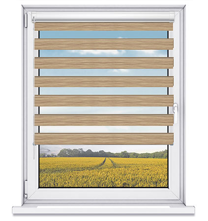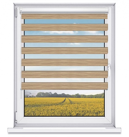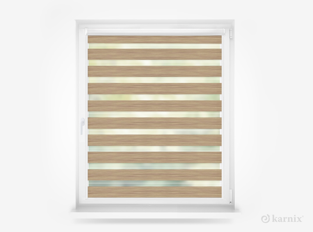 Tkanina Dzień Noc Nature PREMIUM znakomicie harmonizująca ze stylowymi i ekskluzywnymi wnętrzami.Połączenie dwóch naprzemiennych tkanin: jednolitej zaciemniającej oraz siatki przepuszczającej światło. Podczas zwijania rolety pasy te efektownie nachodzą na siebie dzięki czemu pozwalają precyzyjnie zaciemnić pomieszczenie.
