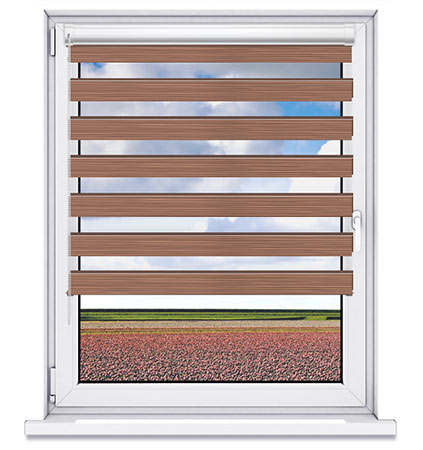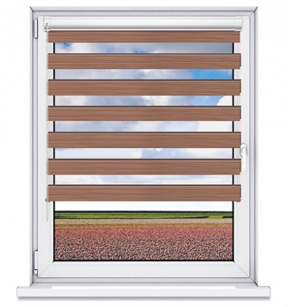 Tkanina Dzień Noc Nature PREMIUM znakomicie harmonizująca ze stylowymi i ekskluzywnymi wnętrzami.Połączenie dwóch naprzemiennych tkanin: jednolitej zaciemniającej oraz siatki przepuszczającej światło. Podczas zwijania rolety pasy te efektownie nachodzą na siebie dzięki czemu pozwalają precyzyjnie zaciemnić pomieszczenie.