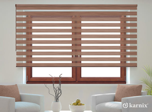NATURE - tkanina Dzień Noc PREMIUM znakomicie harmonizuje ze stylowymi i ekskluzywnymi wnętrzami. NATURE Dzień Noc PREMIUM to połączenie dwóch naprzemiennych materiałów: jednolitego zaciemniającego oraz siatki przepuszczającej światło. Tkanina Dzień Noc umożliwia płynne regulowanie przechodzącej przez materiał ilości światła.