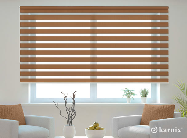 Zasada działania rolet Dzień-Noc. Roletę można także całkowicie zwinąć wpuszczając światło do pomieszczenia.