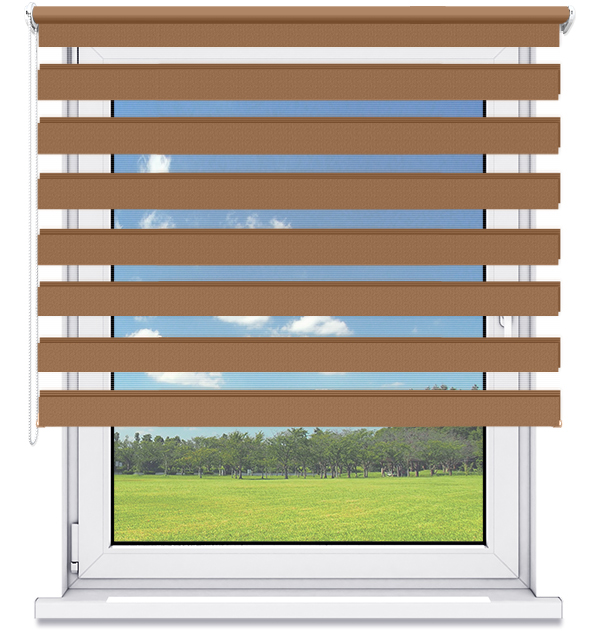 Zasada działania rolet Dzień-Noc. Roletę można także całkowicie zwinąć wpuszczając światło do pomieszczenia.